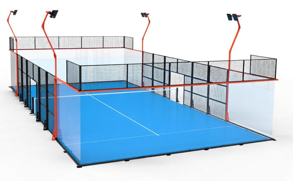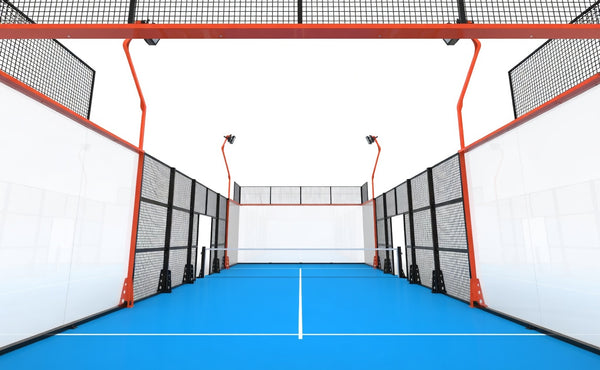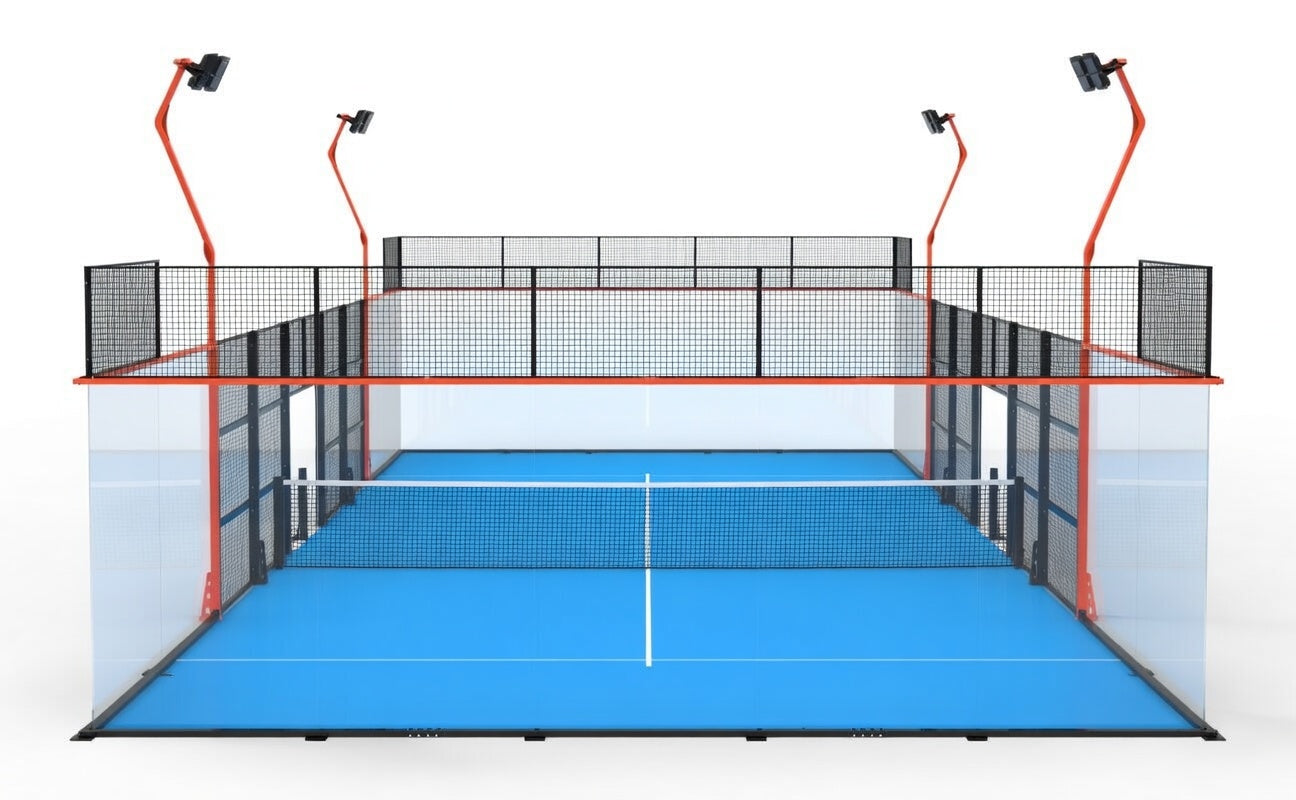 The court is equipped with 12 mm thick tempered safety glass, designed for high impact resistance and professional rebound characteristics.